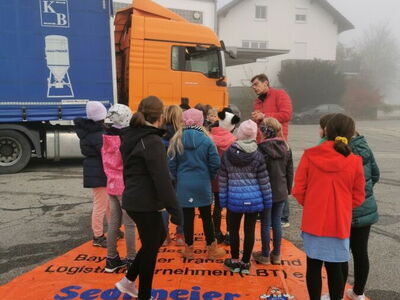 Mit Unterstützung der Spedition W. Myrtek aus Hunderdorf, die auch den Lkw stellte, demonstrierte der LBT-Geschäftsführer (Landesverband für Transport- und Logistikunternehmen) für Niederbayern/Oberpfalz, Harald Sentner, den Kindern anschaulich anhand nachgestellter Situationen mit einem großen Lkw und einer Toter-Winkel-Plane die Gefahrenpotentiale durch den Toten Winkel. Dass auf der Plane die komplette Gruppe Platz hatte und damit dem Lkw-Fahrer verborgen blieb, sorgte doch für einiges Erstaunen. Dazu ergänzte Sentner: „Selbst die Profis, also die Lkw-Fahrer, sind immer wieder verblüfft, wenn sie sehen, wie viel sie nicht sehen.“ Dabei gibt es nicht nur einen Toten Winkel, sondern vier, lernten die Kinder. Diese befinden sich vor und hinter, außerdem links und rechts neben dem Fahrzeug. Gerade letzterer birgt große Gefahren, speziell wenn Lkw nach rechts abbiegen.