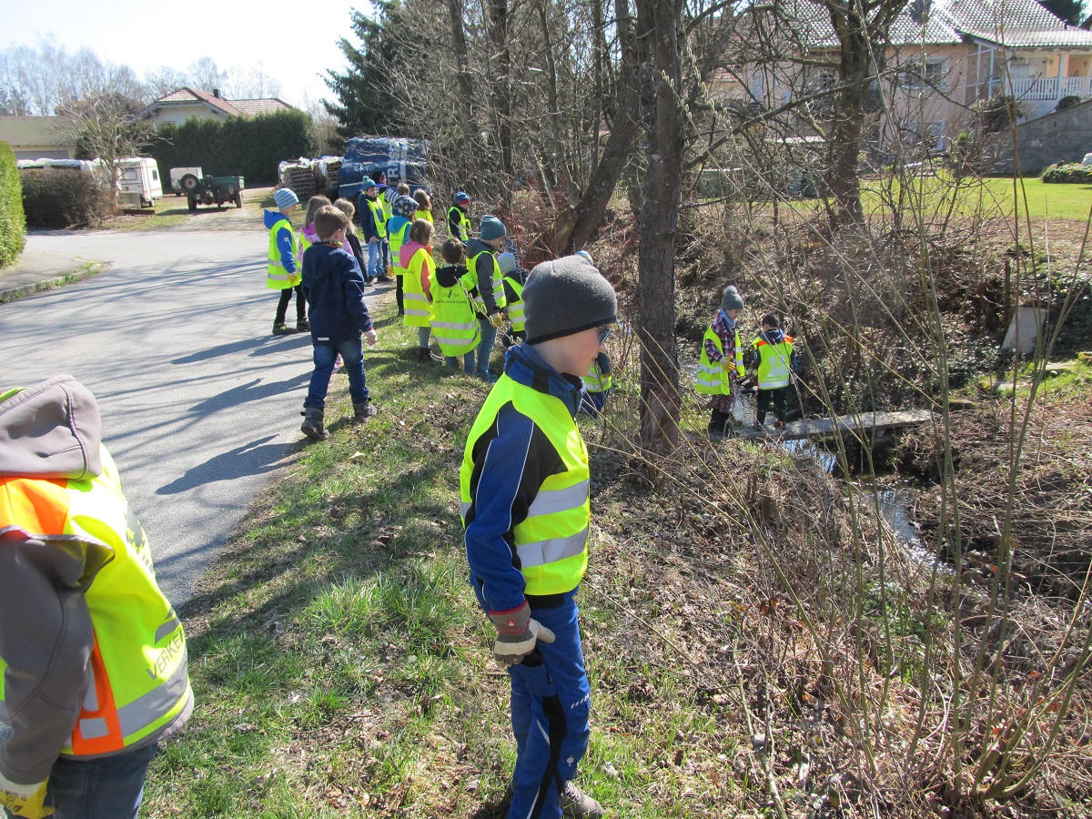 Bei herrlichem Sonnenschein machten sich alle Schülerinnen, Schüler und Lehrer der Grundschule Haselbach bereits am Freitagmittag auf den Weg, um in der Ringstraße in Haselbach ihren Beitrag zur Umweltaktion "Sauber macht lustig" zu leisten. Auf Initiative von Frau Steiniger-Nelz besorgte Bürgermeister Johann Sykora für fast jedes Kind eine gelbe Warnweste und Arbeitshandschuhe. Außerdem lieferte er für jede Klasse noch einen Müllsack mit, der ebenfalls vom ZAW Straubing zur Verfügung gestellt wurde. Einige Schüler hatten ihr Arbeitsgerät selbst mitgebracht, und so konnte der eine oder andere mit Hilfe einer Greifzange auch den entferntesten Dreck aus dem Graben ziehen oder aus dem Gebüsch holen. Voller Eifer und Einsicht, dass sich die Umwelt nicht von alleine reinigt, packten alle beherzt an, krabbelten unter Büsche, wagten sich hinunter zu den Gräben oder holten leere Flaschen aus den hintersten Ecken beim Fußballplatz. Manche Säcke wogen so schwer, dass die Kinder sie nicht mehr schleppen konnten. Zwar fand man keine besondere Kuriositäten, aber einen bleibenden Eindruck vermittelte diese Aktion allemal, da so mancher Fund Entsetzen oder zumindest Erstaunen bei den Schülern hervorrief. Alle freuten sich, als sie mit ihren gut gefüllten Müllsäcken wieder am Schulhaus angekommen waren, um in das wohlverdiente Wochenende zu starten. Mit dem guten Gefühl, die Umwelt in der näheren Umgebung ein klein wenig sauberer gemacht zu haben. Und das ganze hat auch noch Spaß gemacht!