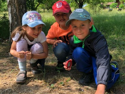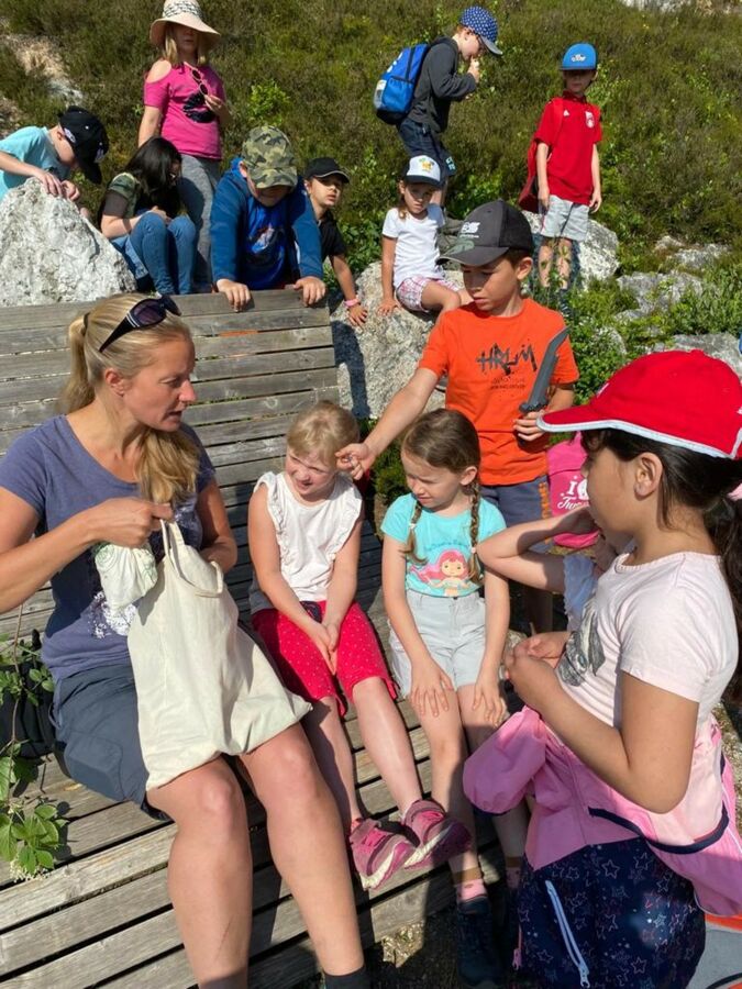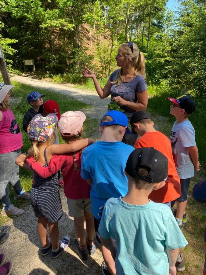 Die Klasse 1b dagegen wurde nach einem kurzen Fußweg am runden Tisch von der Kräuterpädagogin Frau Stelzl erwartet, die den Schülerinnen und Schülern die Wirkung vieler Wiesenpflanzen und -kräuter erklärte. So erprobten sie, wie man eine Brennnessel richtig anfasst, ohne sich zu brennen, und welche Pflanze schnelle Linderung verschafft, sollte es doch einmal zu Hautreaktionen nach dem Kontakt mit Brennnesseln kommen. Doch der Spitzwegerich lindert nicht nur das Brennen nach der Berührung einer Brennnessel, sondern auch juckende Mückenstiche und sogar Husten lässt sich mit einem Saft aus diesem Kraut behandeln. Aus selbst gesammelten Blättern, Zweigen und Steinen gestalteten die Schülerinnen und Schüler außerdem ein individuelles Wiesenbild, das anschließend mit nach Hause genommen werden durfte. Nach einer ausgiebigen Brotzeit machten sich die Kinder mit Lupen und Bechern ausgestattet auf die Suche nach in der Wiese lebenden Tieren und fanden Heupferde, Waldameisen, Falter und zahlreiche weitere Tiere. Zuletzt trafen sich beide Klassen wieder und ließen sich Brote mit selbst gemachtem Kräuterquark aus Wiesenkräutern und selbst gemachter Butter und Marmelade schmecken.