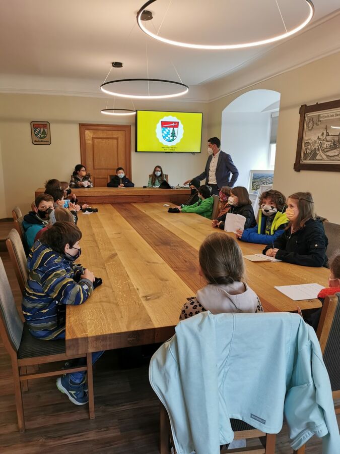 Am 26. April machte sich die Klasse 4a zu einem Besuch ins Rathaus auf. Nachdem das Thema Gemeinde ausführlich im Unterricht behandelt worden war, wollte man das Ganze jetzt vor Ort erkunden. Bürgermeister Andi Liebl, unterstützt von Herrn Mühlbauer, nahm sich viel Zeit und erklärte den Kindern alle Ämter und deren Aufgaben. Am Ende durfte die Klasse im neuen Sitzungssaal ihre gesammelten Fragen stellen. Für jeden Schüler und jede Schülerin gab es ein kleines Büchlein über die Gemeinde als Geschenk mit Widmung des Bürgermeisters.