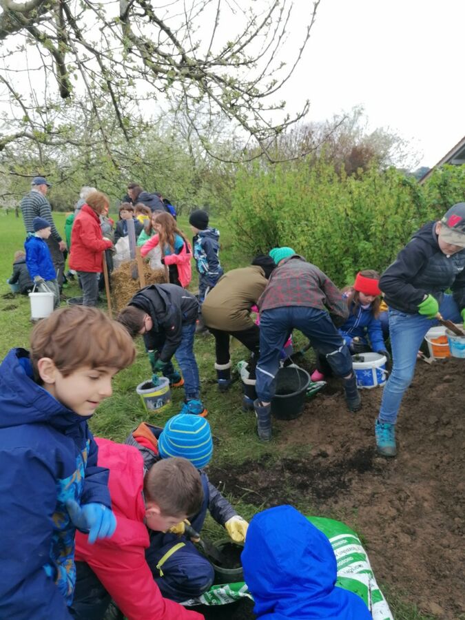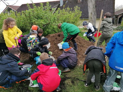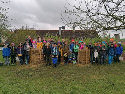 Ausgestattet mit Gummistiefeln, Matschhosen, Gartenhandschuhen, kleinen Eimern und Schaufeln ging es zu Fuß über Wiesen und durch den Wald Richtung Weingarten. Dort angekommen durften sich die Kinder zunächst mit ihrer mitgebrachten Brotzeit stärken. Im Anschluss wurden in Kleingruppen und mit Unterstützung von weiteren OGV- Helfern drei Kartoffeltürme mit Hilfe von Holzlatten, Maschendraht, Stroh, Erde und Pferdemist gebaut.