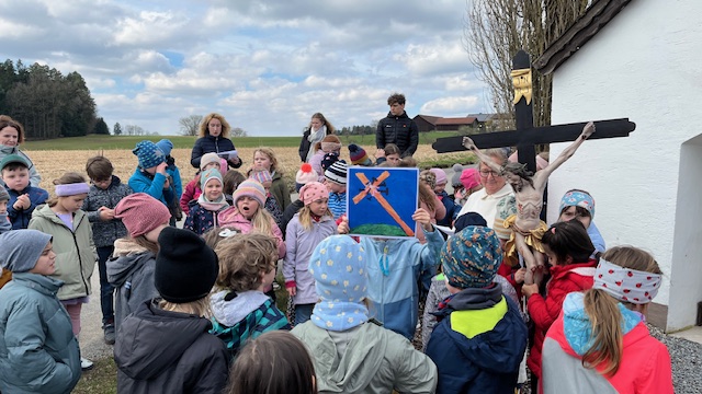 Alle Kinder der Haselbacher Schule machten sich im Rahmen des Religionsunterrichts gemeinsam auf den Weg, an das Leiden und Sterben Jesu zu erinnern. Den Weg-Kreuzweg bereitete Gemeindereferentin Birgit Blatz vor. Sie brachte Fotos und das Karfreitags-Kreuz mit, das die Kinder immer abwechselnd von Station zu Station trugen, und auch die Lehrerinnen wurden mit einbezogen, indem sie Textstellen vorlasen. Nicht nur Jesus litt unter der schweren Last des Kreuzes, er, der die Schuld der Menschen auf seine Schultern geladen hatte. Die Kinder mussten fest zusammenhelfen und vorsichtig sein, damit sie das wunderschöne Holzkreuz unbeschadet durch die Haselbacher Natur tragen konnten. Maxi wollte es alleine versuche, merkte aber ziemlich schnell, dass es gar nicht so einfach ist, wenn man das Kreuz ohne Unterstützung tragen möchte. Bereits vor Beginn des Weg-Kreuzweges erhielt jeder, der es gerne wollte ein kleines Holzkreuz, mit dem er sich auf den Weg machte und es symbolisch für Jesus und die Lasten, die uns und andere drücken, mitragen konnte. Nach zahlreichen Gebeten und Gesängen kehrten die Schüler wieder zur Schule zurück. Mit dem Kreuz in der Jackentasche machten sie sich auf den Weg nach Hause, wo sie noch lange an ihren Weg-Kreuzweg erinnert werden oder es schön bunt ausgestalten können.