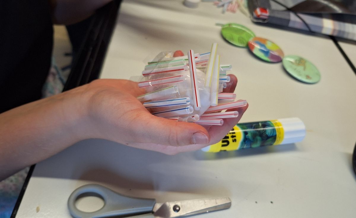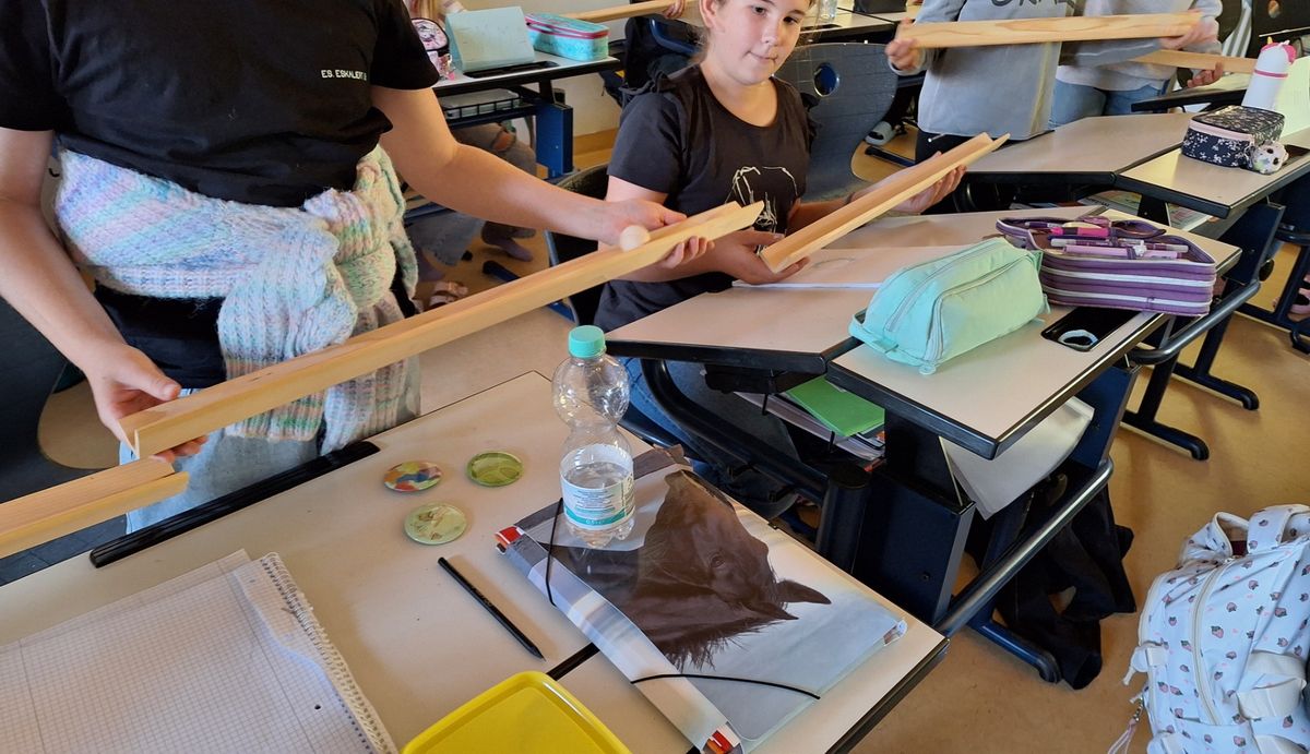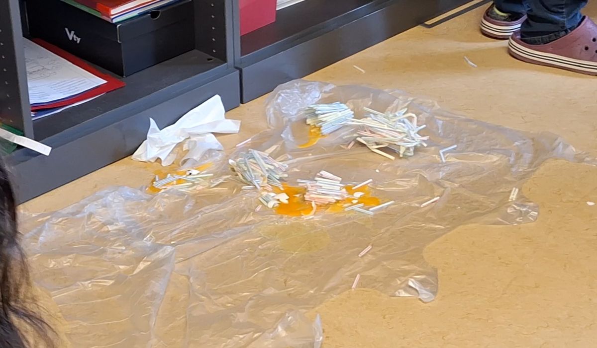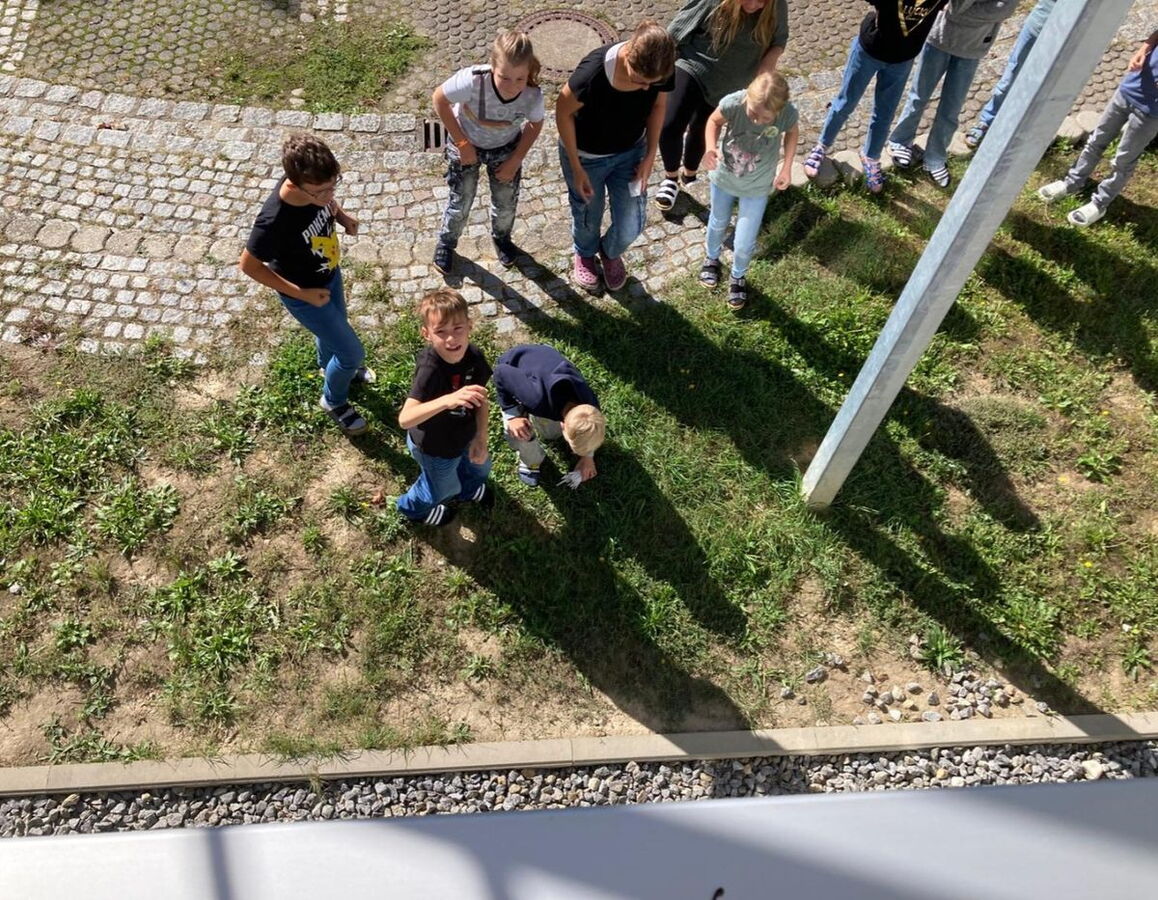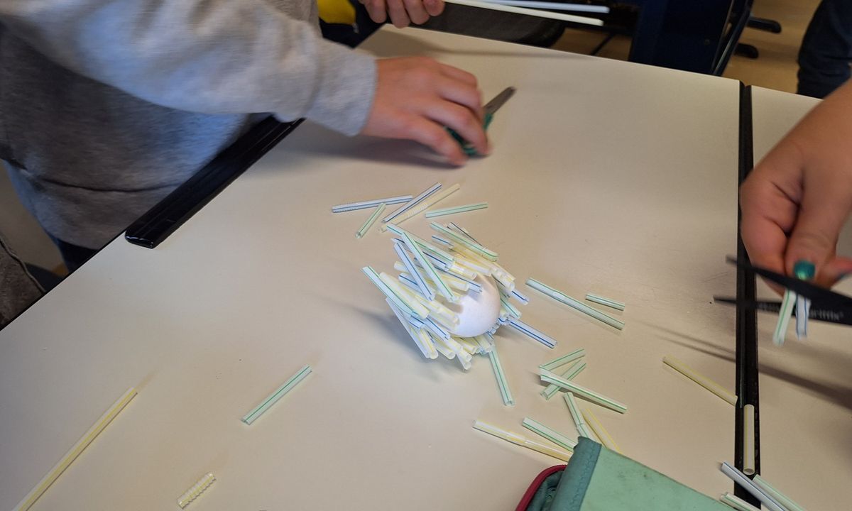 Um ein Ei nach dem freien Fall vor einer "Bruchlandung" zu retten, mussten die Kinder in kleinen Gruppen mit Hilfe von Strohhalmen und Tesa eine Rettungskapsel basteln. Die 5a versenkte die Eier dann im Pausenhof, die 5b in Ermangelung eines höher gelegenen Klassenzimmers vom Schrank.