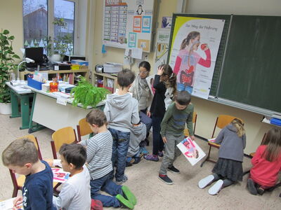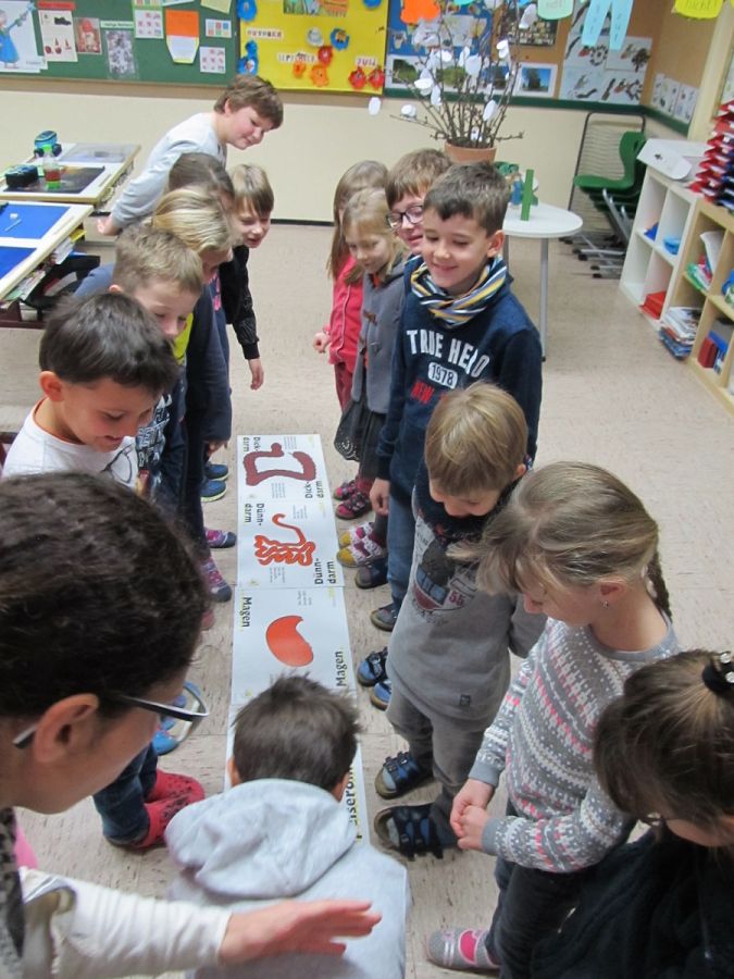 Die Klassen 2a und 2b der Grundschule in Haselbach nehmen heuer bereits das 2. Jahr an der Aktion „Klasse 2000“ teil. Frau Neubert, die nun die Kinder in regelmäßigen Abständen besuchen wird, führte mit der Stunde „Der Weg der Nahrung“ in das diesjährige Thema ein. Was passiert mit meinem Essen, das in meinem Mund verschwindet? Diese Frage versuchten die Schüler mit Hilfe eines Klebepuzzles zu beantworten. Anschaulich erklärt an einem übersichtlichen Plakat waren die Kinder nun fit, selbst die Nahrung, den Mund, die Speiseröhre, den Magen, den Dünn- und den Dickdarm zu spielen, und den Weg der Nahrung zu durchwandern. Das gab vielleicht ein „Hallo“, als man als Nahrung am Ende der Schlange aus dem Dickdarm geschoben wurde. Bis zum nächsten Mal werden sich nun die Lehrerinnen Frau Fuchshuber und Frau Bach-Jobst zusammen mit den Schülern Gedanken zur gesunden Ernährung, der Nahrungspyramide und den einzelnen Nährstoffen machen, bevor Klaro, das Maskottchen, wieder in den Klassenzimmern von Haselbach zu Besuch kommt.