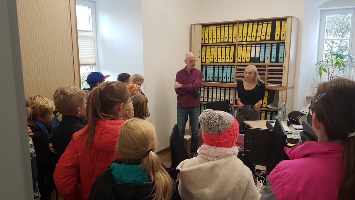 Im Oktober besuchte die Klasse 4b im Rahmen des Unterrichts das Rathaus in Mitterfels. Herr Mühlbauer, der Geschäftsstellenleiter, führte die Schülerinnen und Schüler durch alle Räume, sogar in die „Katakomben“ im Keller. Er beantwortete geduldig alle Fragen, ebenso wie Bürgermeister Heinrich Stenzel, der sich auch Zeit nahm für die Kinder und im Sitzungssaal Rede und Antwort stand.