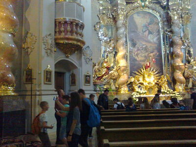 Frau Bosl-Seitz entführte uns zuerst in die Unterwelt (> Gruft) der Ursulinenkirche. Anschließend erhielten wir Infos (> Stuckmarmor, Reliquienschreine/ Reliquienhandel, Altarbild) zu der von den Asam-Brüdern gestalteten Klosterkirche.
