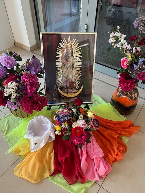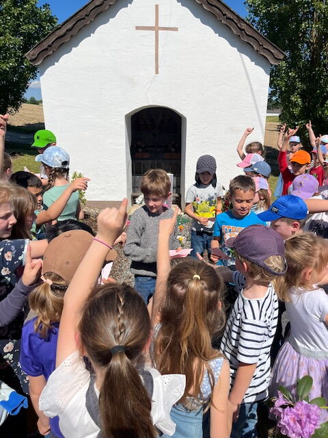 Bei strahlendem Sonnenschein machten sich alle Kinder der GS Haselbach auf zur Kapelle am Ortsrand, wo sie konfessionsübergreifend eine Maiandacht abhielten. Vogelgezwitscher, Blumen und die wärmenden Sonnenstrahlen veranschaulichten den Schülern, wie reich die Natur im Wonnemonat Mai ausgestattet ist. Dankbar und mit ein paar Herzensangelegenheiten im Gepäck, sangen und beteten alle gemeinsam und brachten ihre Blumen als Zeichen der Lebensfreude und Demut zur Gottesmutter. Bis zum Beginn der Pfingstferien werden die gefüllten Blumenvasen das Marienbild in der Aula zieren und die Herzenswünsche im Korb verbleiben.