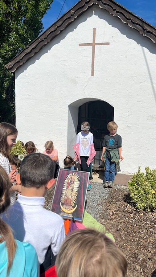 Konfessionsübergreifend machten sich bei strahlendem Sonnenschein alle Kinder der Grundschule Haselbach auf den Weg durch die blühende Natur, um am Ende des Dorfes miteinander eine Maiandacht zu gestalten. Josefine, Matthias und Annika entzündeten zu Beginn jeweils eine Kerze und sprachen dazu ein kurzes Gebet. Im Mittelpunkt stand ein großes Marienbild, das immer wieder in die Überlegungen, Gesänge und Gebete miteingebunden wurde. Alle Schülerinnen und Schüler brachten ein Gänseblümchen oder eine Margerite mit, um es intensiv zu betrachteten, mit ihrem Leben in Verbindung zu bringen und schließlich zu Blumenkränzen zu binden. Nachdem Kinder der Klasse 2b ihre Fürbitten vorgetragen hatten, sang man noch ein gemeinsames Schlusslied und kehrte schließlich zur Schule zurück.