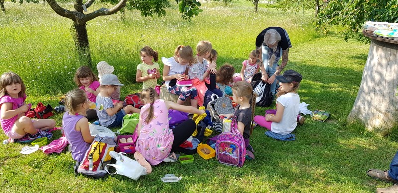 Bei strahlendem Sonnenschein machten sich die beiden 1. Klassen gemeinsam mit den künftigen Schulanfängern aus Haselbach und Mitterfels auf den Weg zum Obstlehrgarten nach Weingarten. Im Rahmen eines Kooperationstages mit den beiden Kitas nahmen wir das Thema „Wald und Wiese“ genauer in Augenschein. Bereits bei der Wanderung nach Weingarten sammelten alle Kinder Schätze aus Wald und Wiesen für ihre Waldschatztruhe und lernten sich so schon gegenseitig gut kennen.