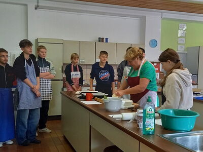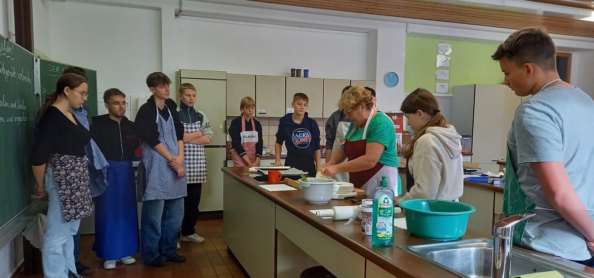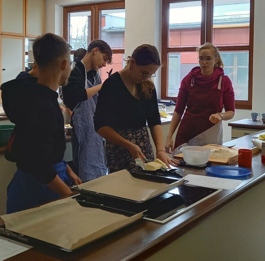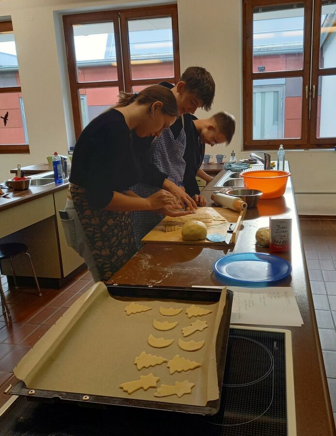 Im Rahmen des Projekts „Praxis an Mittelschulen“ fertigten die Schülerinnen und Schüler der Gruppe Ernährung- und Soziales der 9. Klasse gemeinsam mit ihrer Lehrkraft Kathrin Bogenberger und den beiden externen Backexpertinnen Frau Zollner und Frau Krieger fünf verschiedene Sorten traditioneller Plätzchen an.