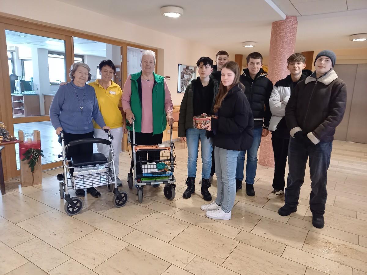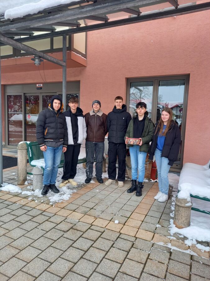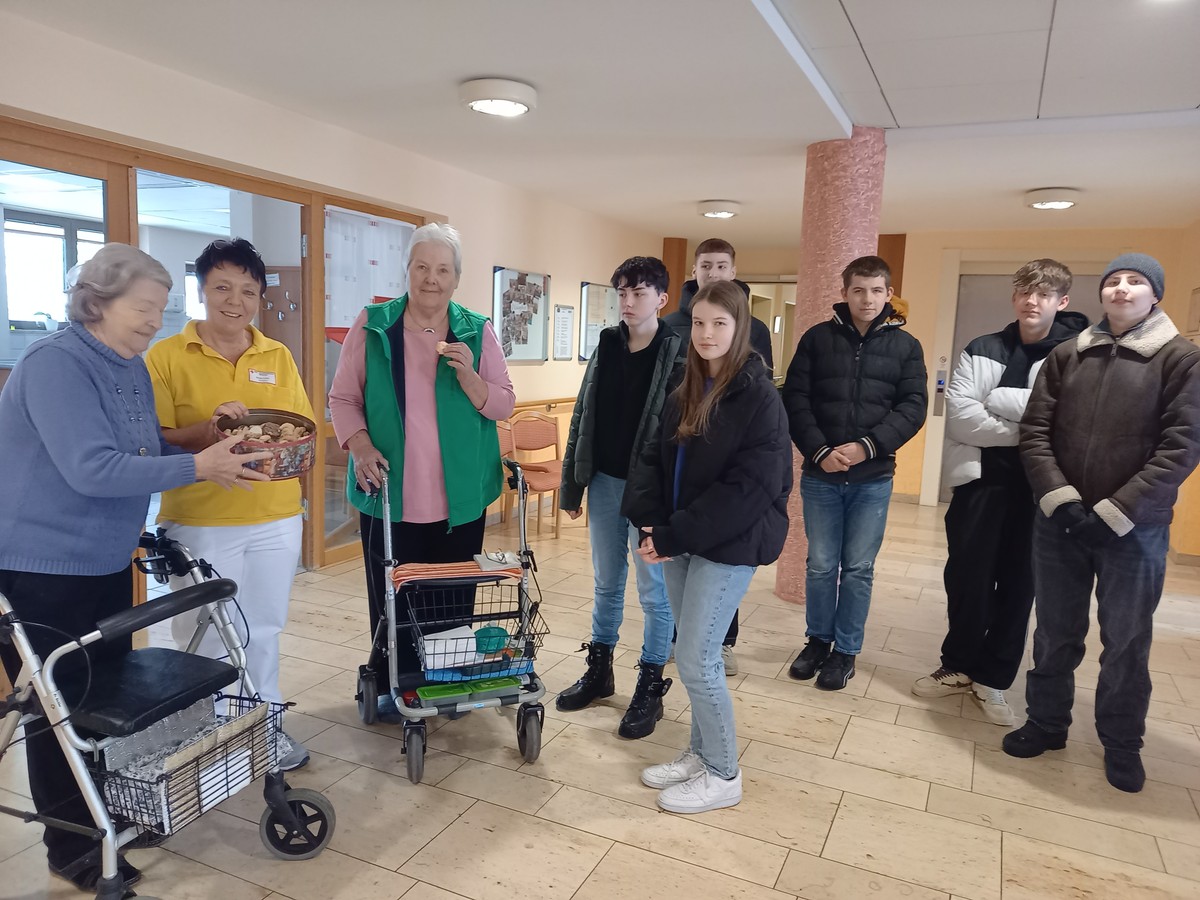 Für die Nikolausfeier des BRK-Altenheimes brachten die fleißigen Bäcker eine große Dose gefüllt mit Butterplätzchen, Vanillekipferl, Nusstaler, Spitzbuam und Kokosmakronen zu den Bewohnerinnen und Bewohnern. Diese freuten sich sehr und waren der Meinung, dass die Mitterfelser Mittelschüler gerne wieder etwas zum Naschen vorbei bringen dürften.