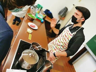 Fachkundig erzählte der gelernte Koch von seinem Werdegang und den Möglichkeiten als Koch in der Gastronomie Fuß zu fassen. Beim gemeinsamen Kochen eines leckeren Dinkelrisottos mit gebratenem Schweinehals und Feldsalat ging er auf die Vorteile saisonaler Produkte aus regionaler Vermarktung ein und legte den Jugendlichen ans Herz, sich zu trauen auch einmal unbekanntes, heimisches Gemüse oder Obst auszuprobieren.