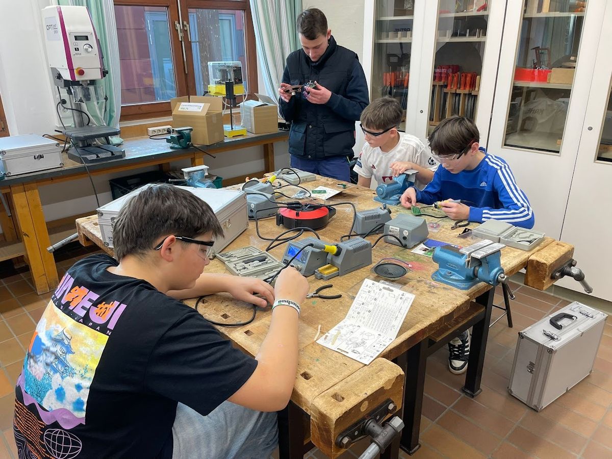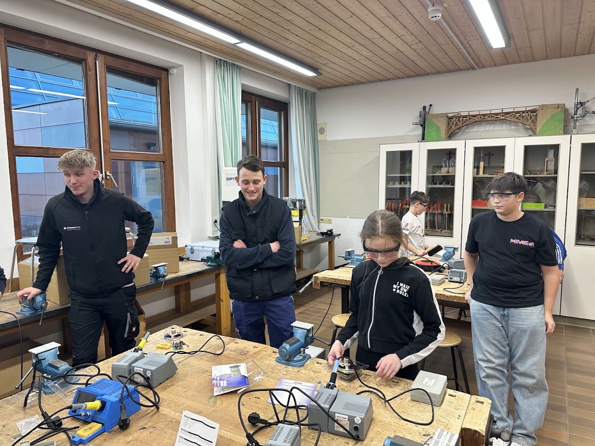 Wieder nahmen im Rahmen dieses Angebots Schüler der 6. Klasse der Grund- und Mittelschule Mitterfels-Haselbach teil. Dieses Mal stand der Bau eines Alarmschalters, oder auch Stimmenverzerrers, sowie einer Signallichtanlage im Rahmen des Fortgeschrittenenkurses auf dem Plan. Dieser Herausforderung stellten sich 7 Schülerinnen und Schüler mit Begeisterung und Engagement. Hervorragende Unterstützung erhielten sie von bis zu drei Auszubildenden der Firma Strama-MPS, welche der Grund- und Mittelschule Mitterfels-Haselbach seit 2011 bei diesem Angebot höchste Förderung zuteilwerden lässt. Hierfür ist die Schule äußerst dankbar. Auf den entsprechenden Kurs im kommenden Schuljahr freuen sich bereits jetzt sowohl die Schüler, als auch die Auszubildenden der Firma Strama-MPS.