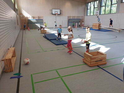 Neben den Spielen im Freien fand endlich wieder ein Ereignis in der schönen, neuen Haselbacher Turnhalle statt. Nacheinander trat jede Klasse beim Grundschulwettbewerb an. Dieser Vielseitigkeitswettbewerb umfasste acht Aufgaben aus den Bereichen des Lehrplans „Mit dem Ball rollen, werfen und fangen“, „Springen“, „Klettern und Balancieren“ sowie „Stützen und Rollen“ und „Hüpfen, Federn, Laufen“. Immer wieder konnte man Stimmen wie „Jetzt traue ich mich endlich auch die Rolle vorwärts zu turnen“ oder „Das Slalomdribbeln war doch gar nicht so schwer“ unter den Kindern hören und so war der Applaus groß, als beim Abschlusstreffen jeder Teilnehmer seine verdiente Urkunde überreicht bekam. Mit roten Köpfen gingen alle glücklich nach Hause und waren sich einig: „Die lange Zeit im Distanzunterricht konnte uns nichts anhaben, in Haselbach da sind die Sportler daheim!“