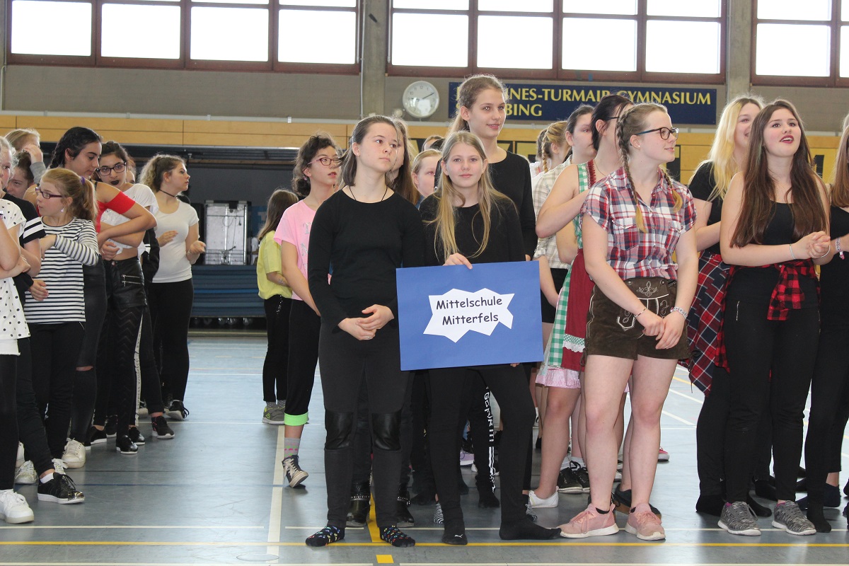 Höhepunkt des Tanzfestes war der „Flashmob“, den die Schülerinnen 9. Klassen der Mittelschule Mitterfels in Dirndlkleid und Lederhose inszenierten. Alle Schülerinnen aus Hunderdorf und Mitterfels konnten sich hier beteiligen und ihre Begeisterung für das Tanzen ausdrücken.