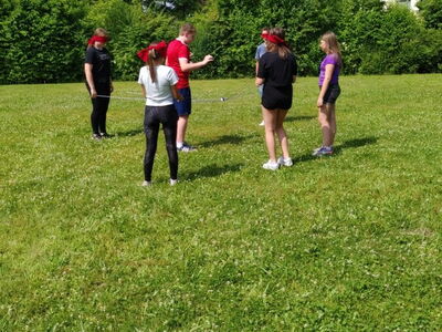Einen informativen Vormittag verbrachten die Schülerinnen und Schüler der Klasse M7 zusammen mit ihren Fachlehrerinnen Fr. Bogenberger und Fr. Simmel am 22.06.2022 an der Berufsfachschule in Mitterfels. Nach einem kurzen Überblick über die drei Zweige der Marianne-Rosenbaum-Schule wurde in kleinen Gruppen, zusammen mit Schülerinnen und Schülern der Berufsfachschule, einiges ausprobiert und hergestellt. So durften wir in der großen Lehrküche Waffeln backen und die extra für uns selbstgebackenen Schildkrötensemmeln belegen. Frisch gestärkt ging es weiter zur Musikstunde in der Kinderpflege. Dort erhielten wir einen Einblick in die Arbeit im Kindergarten und wie dort gemeinsam Lieder erarbeitet werden. Schritt für Schritt erlernten so alle in kurzer Zeit einen Sprechgesang mit Bodypercussion. Bei der Sozialpflege konnte am eigenen Körper erfahren werden, wie es ist blind zu sein und sich um jemand zu kümmern, der selber nicht sehen kann. Gemeinsam musste eine knifflige Aufgabe in Teamarbeit bewältigt werden. Anhand eines Blindenalphabets konnten wir noch versuchen Buchstaben zu erfühlen. Zu guter Letzt bedankten wir uns für die tollen Angebote und Einblicke und gingen zurück zur Schule.