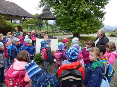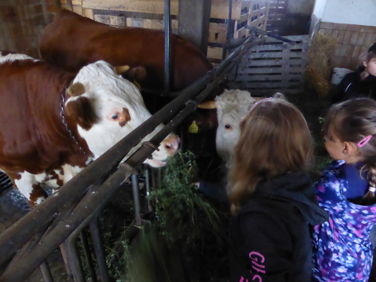 Nach einem lustigen Fußmarsch von Haselbach zum Bruckhof trafen die Kinder der Klassen 1a und 1b zusammen mit ihren Lehrerinnen Birgit Fuchshuber, Claudia Bach-Jobst und der Religionslehrerin Birgit Blatz am Bauernhof der Familie Frankl ein. Alle versammelten sich um den Brunnen, der den Mittelpunkt des Hofes darstellt. Aber neben dem Füttern von Kamerun-Schafen und Kühen, durften alle auch die Hühner und Enten bestaunen, Katzen streicheln. Außerdem erfuhren sie eine Menge über die Verarbeitung von Milch. Rahm kam in ein Butterfass, das jeder einmal kräftig drehen musste, damit darin Butter entstand. Diesen ließen sich die Kinder auf einem leckeren Brot gut schmecken und tranken dazu frisch gepressten Apfelsaft. Als Vorbereitung für die Woche der Gesundheit und Nachhaltigkeit endete der Besuch auf dem Bauernhof mit vielen neuen Eindrücken und enormen Wissenszuwachs.