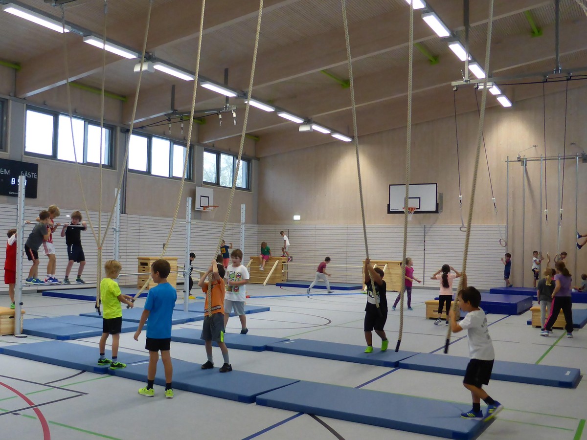 Am Dienstag verbrachten die Kinder den ganzen Vormittag entweder in der Turnhalle, wo sie an unterschiedlichen Stationen ihre Beweglichkeit, Balancierfähigkeit oder Sprungkraft unter Beweis stellen konnten, oder sie probierten die Übungen von „Voll in Form“ im neuen Gymnastikraum aus. Aber auch Ruhe, Konzentration und Zusammenhalt waren von Nöten, um die Spiele für die Regenpause gemeinsam im Team bewältigen zu können.