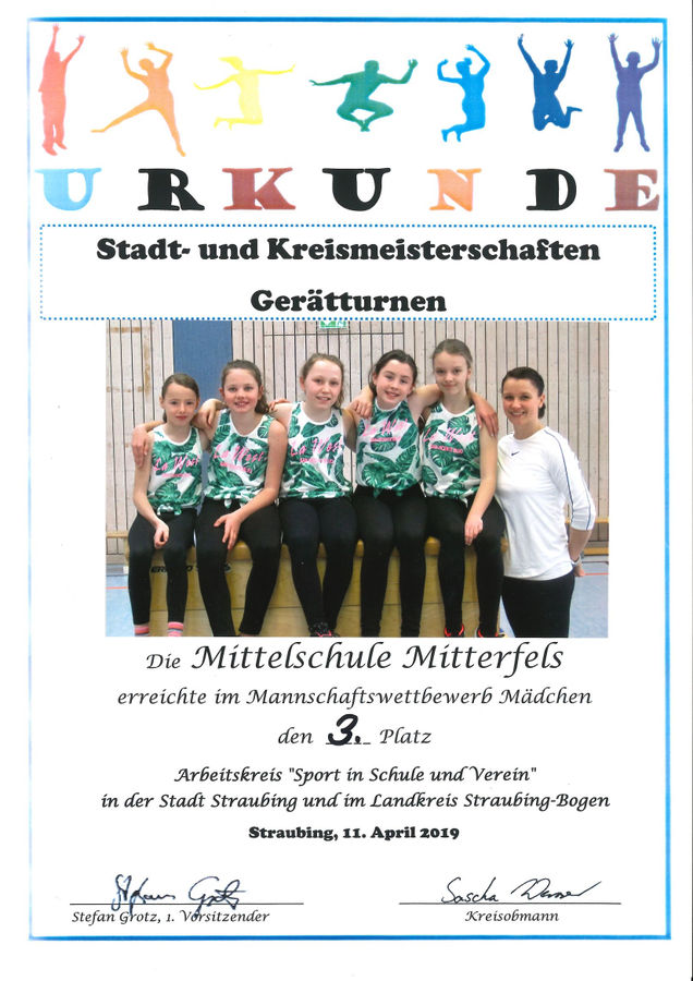 Bei den Stadt- und Landkreismeisterschaften im Geräteturnen freuten sich die Mädchen der 5. Klasse der Grund- und MIttelschule mit ihrer Lehrkraft Marina Würdinger über einen erfolgreichen 3. Platz.
