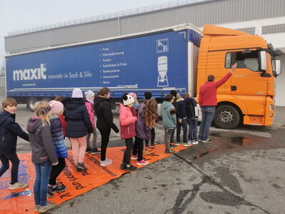 Mit Unterstützung der Spedition W. Myrtek aus Hunderdorf, die auch den Lkw stellte, demonstrierte der LBT-Geschäftsführer (Landesverband für Transport- und Logistikunternehmen) für Niederbayern/Oberpfalz, Harald Sentner, den Kindern anschaulich anhand nachgestellter Situationen mit einem großen Lkw und einer Toter-Winkel-Plane die Gefahrenpotentiale durch den Toten Winkel. Dass auf der Plane die komplette Gruppe Platz hatte und damit dem Lkw-Fahrer verborgen blieb, sorgte doch für einiges Erstaunen. Dazu ergänzte Sentner: „Selbst die Profis, also die Lkw-Fahrer, sind immer wieder verblüfft, wenn sie sehen, wie viel sie nicht sehen.“ Dabei gibt es nicht nur einen Toten Winkel, sondern vier, lernten die Kinder. Diese befinden sich vor und hinter, außerdem links und rechts neben dem Fahrzeug. Gerade letzterer birgt große Gefahren, speziell wenn Lkw nach rechts abbiegen.
