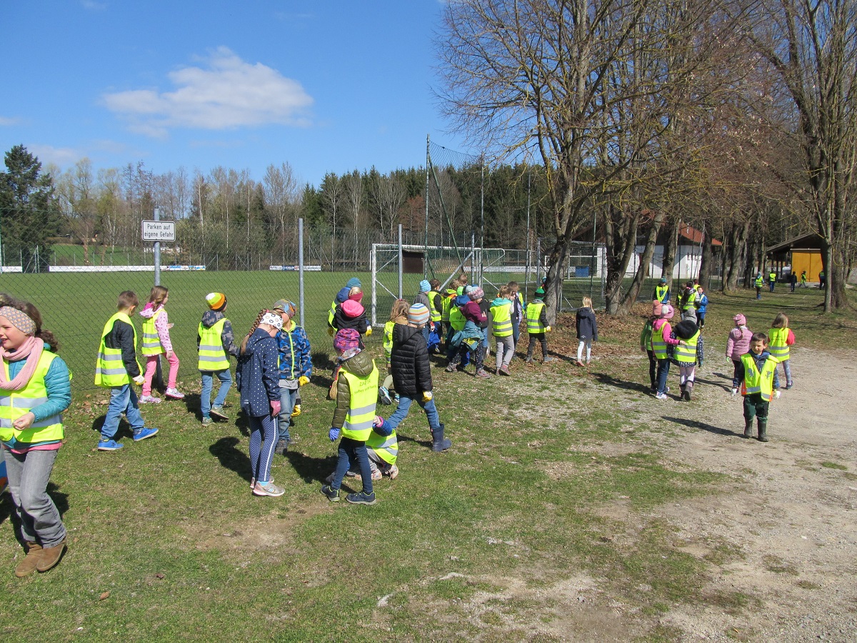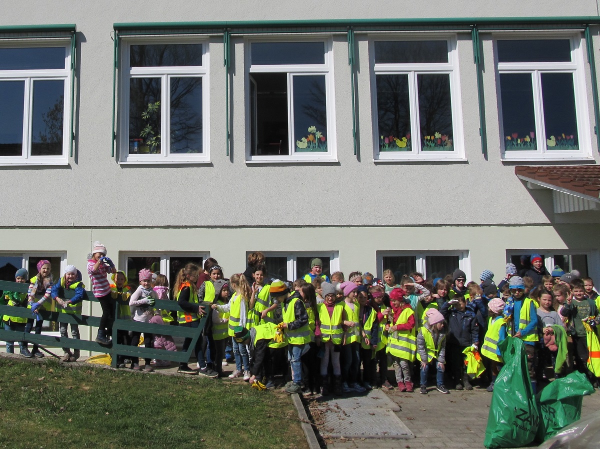 Bei herrlichem Sonnenschein machten sich alle Schülerinnen, Schüler und Lehrer der Grundschule Haselbach bereits am Freitagmittag auf den Weg, um in der Ringstraße in Haselbach ihren Beitrag zur Umweltaktion "Sauber macht lustig" zu leisten. Auf Initiative von Frau Steiniger-Nelz besorgte Bürgermeister Johann Sykora für fast jedes Kind eine gelbe Warnweste und Arbeitshandschuhe. Außerdem lieferte er für jede Klasse noch einen Müllsack mit, der ebenfalls vom ZAW Straubing zur Verfügung gestellt wurde. Einige Schüler hatten ihr Arbeitsgerät selbst mitgebracht, und so konnte der eine oder andere mit Hilfe einer Greifzange auch den entferntesten Dreck aus dem Graben ziehen oder aus dem Gebüsch holen. Voller Eifer und Einsicht, dass sich die Umwelt nicht von alleine reinigt, packten alle beherzt an, krabbelten unter Büsche, wagten sich hinunter zu den Gräben oder holten leere Flaschen aus den hintersten Ecken beim Fußballplatz. Manche Säcke wogen so schwer, dass die Kinder sie nicht mehr schleppen konnten. Zwar fand man keine besondere Kuriositäten, aber einen bleibenden Eindruck vermittelte diese Aktion allemal, da so mancher Fund Entsetzen oder zumindest Erstaunen bei den Schülern hervorrief. Alle freuten sich, als sie mit ihren gut gefüllten Müllsäcken wieder am Schulhaus angekommen waren, um in das wohlverdiente Wochenende zu starten. Mit dem guten Gefühl, die Umwelt in der näheren Umgebung ein klein wenig sauberer gemacht zu haben. Und das ganze hat auch noch Spaß gemacht!