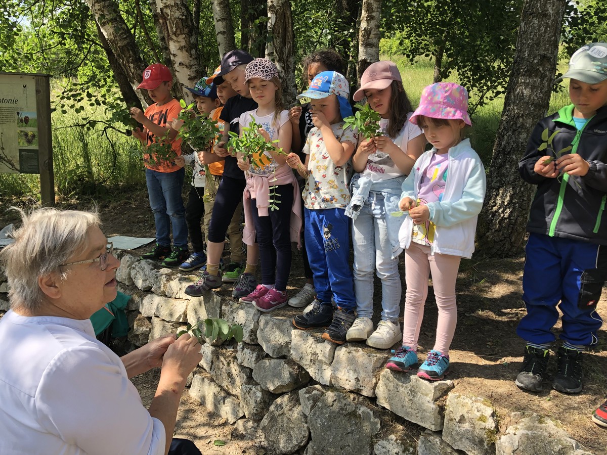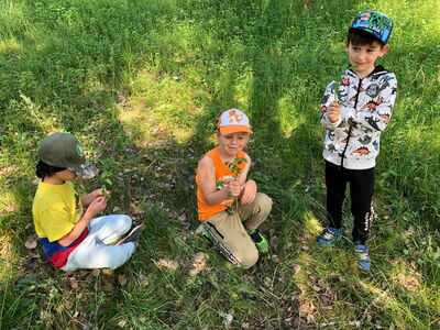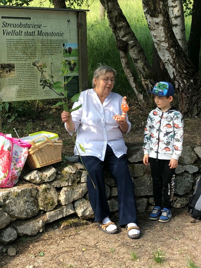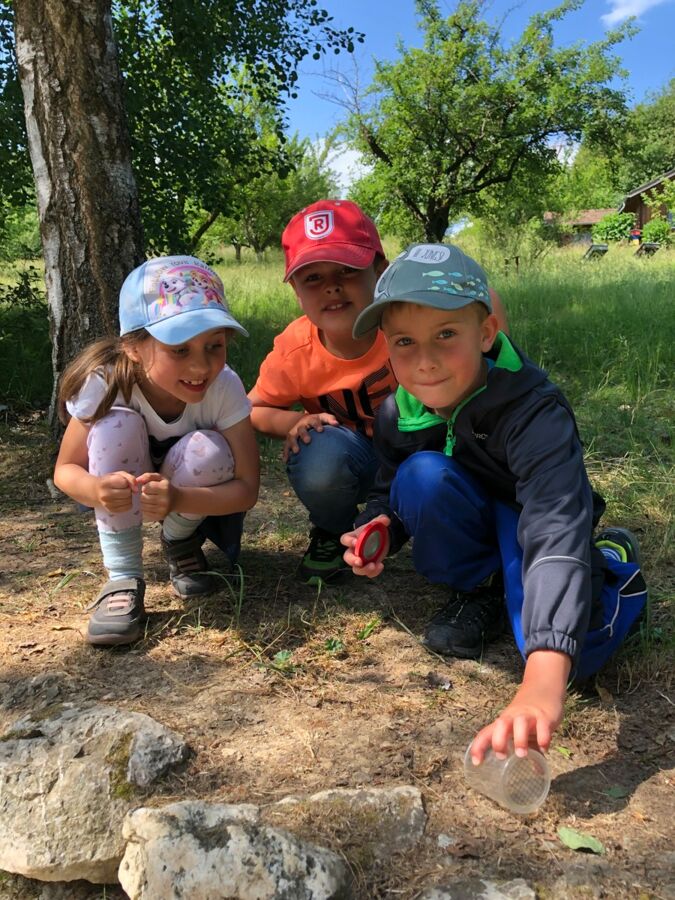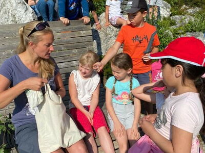 Die Klasse 1b dagegen wurde nach einem kurzen Fußweg am runden Tisch von der Kräuterpädagogin Frau Stelzl erwartet, die den Schülerinnen und Schülern die Wirkung vieler Wiesenpflanzen und -kräuter erklärte. So erprobten sie, wie man eine Brennnessel richtig anfasst, ohne sich zu brennen, und welche Pflanze schnelle Linderung verschafft, sollte es doch einmal zu Hautreaktionen nach dem Kontakt mit Brennnesseln kommen. Doch der Spitzwegerich lindert nicht nur das Brennen nach der Berührung einer Brennnessel, sondern auch juckende Mückenstiche und sogar Husten lässt sich mit einem Saft aus diesem Kraut behandeln. Aus selbst gesammelten Blättern, Zweigen und Steinen gestalteten die Schülerinnen und Schüler außerdem ein individuelles Wiesenbild, das anschließend mit nach Hause genommen werden durfte. Nach einer ausgiebigen Brotzeit machten sich die Kinder mit Lupen und Bechern ausgestattet auf die Suche nach in der Wiese lebenden Tieren und fanden Heupferde, Waldameisen, Falter und zahlreiche weitere Tiere. Zuletzt trafen sich beide Klassen wieder und ließen sich Brote mit selbst gemachtem Kräuterquark aus Wiesenkräutern und selbst gemachter Butter und Marmelade schmecken.