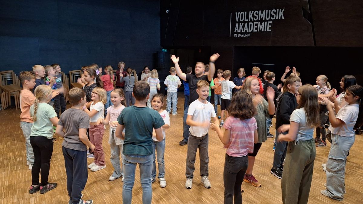 Die Klassen 4a und 4b unternahmen gemeinsam mit ihren Klassenlehrerinnen und ihrer Musiklehrerin einen spannenden Ausflug zur Volksakademie in Freyung. Schon früh am Morgen machten sich die Schülerinnen und Schüler voller Vorfreude auf den Weg – schließlich stand ein ganzer Tag im Zeichen der Musik und des Tanzes bevor.