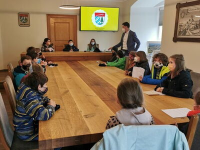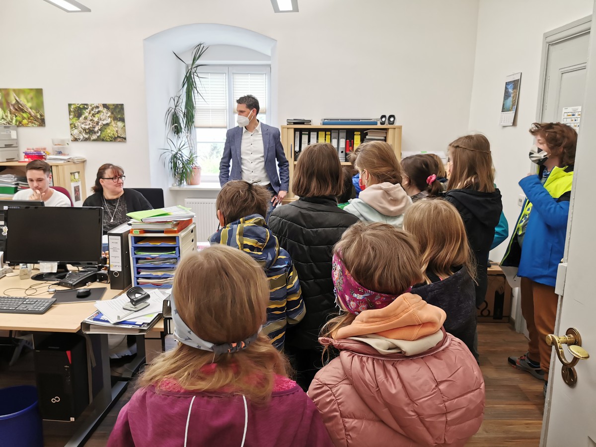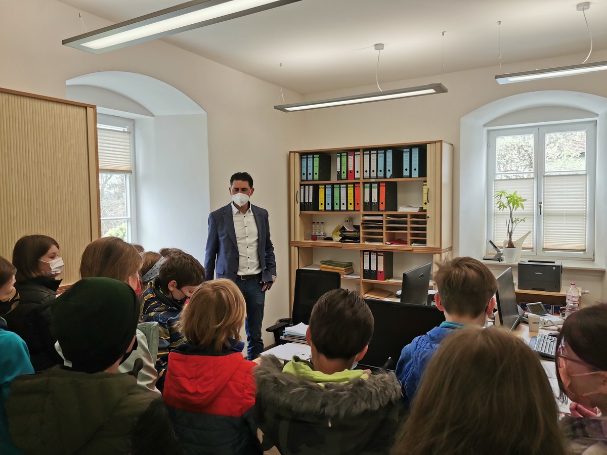 Am 26. April machte sich die Klasse 4a zu einem Besuch ins Rathaus auf. Nachdem das Thema Gemeinde ausführlich im Unterricht behandelt worden war, wollte man das Ganze jetzt vor Ort erkunden. Bürgermeister Andi Liebl, unterstützt von Herrn Mühlbauer, nahm sich viel Zeit und erklärte den Kindern alle Ämter und deren Aufgaben. Am Ende durfte die Klasse im neuen Sitzungssaal ihre gesammelten Fragen stellen. Für jeden Schüler und jede Schülerin gab es ein kleines Büchlein über die Gemeinde als Geschenk mit Widmung des Bürgermeisters.