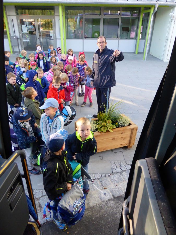 Bereits am Ende der zweiten Schulwoche besuchte Polizeihauptkommissar Johann Pleischl von der Polizeistation Bogen die ABC-Schützen der Grundschule Haselbach, um mit ihnen gemeinsam das richtige Verhalten vor, während und nach einer Busfahrt zu besprechen und einzuüben. Obwohl viele Kinder Herrn Pleischl bereits als Vorschüler kennengelernt hatten, war es trotzdem wichtig, die einzelnen Stationen zu wiederholen und zu intensivieren. Mit der Schultasche auf dem Rücken, stellten sich die Kinder hintereinander an. Dass man an der Bushaltestelle nicht schubsen, laufen oder herumhopsen darf, war allen sofort einsichtig, da die Gefahr, auf die Straße und damit vor ein Auto zu stürzen zu groß wäre. Die Schultaschen wurden mit gebührendem Abstand hintereinander aufgereiht und erst wieder geholt, als der Bus an der Bushaltestelle vorfuhr. Ohne Drängeln oder Schubsen, aber mit einem freundlichen "Hallo!" für den Busfahrer auf den Lippen, stiegen die Kinder in den Bus ein, füllten die Sitzplätze von vorne her auf und verstauten ihre Taschen unter den Beinen bzw. unter dem Vordersitz. Ruhig sitzenbleiben, damit sich der Busfahrer auf den Verkehr und sein Fahrzeug konzentrieren kann, das leuchtet den Schulanfängern ein. Außerdem ist allen klar, dass weder der Bus beschmiert werden darf, noch während der Fahrt aufgestanden werden soll. Sicherheit geht vor. Schließlich fuhr Johann Pleischl zusammen mit den Klassen 1a und 1b und den Lehrerinnen Frau Birgit Fuchshuber und Frau Claudia Bach-Jobst zu einer nahe gelegenen Bushaltestelle, um vor Ort das Aussteigen üben zu können. Geordnetes Aussteigen, schauen, ob Radfahrer oder andere Verkehrsteilnehmer nahe am Bus vorbei wollen waren die zwei Schwerpunkte bei dieser Station. Zurück an der Schule vertieften die Kinder noch einmal die gelernten Verhaltensregeln und verabschiedeten Polizeihauptkommissar Pleischl, bevor sie in den Klassenräumen ihr Wissen schriftlich sicherten.
