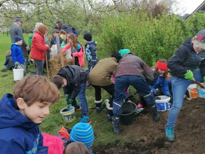 Ausgestattet mit Gummistiefeln, Matschhosen, Gartenhandschuhen, kleinen Eimern und Schaufeln ging es zu Fuß über Wiesen und durch den Wald Richtung Weingarten. Dort angekommen durften sich die Kinder zunächst mit ihrer mitgebrachten Brotzeit stärken. Im Anschluss wurden in Kleingruppen und mit Unterstützung von weiteren OGV- Helfern drei Kartoffeltürme mit Hilfe von Holzlatten, Maschendraht, Stroh, Erde und Pferdemist gebaut.