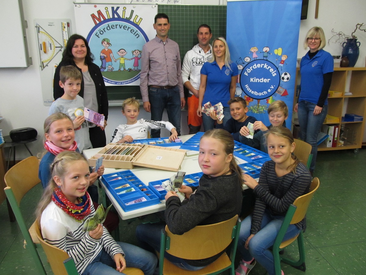Noch rechtzeitig vor den Herbstferien konnten Vorstände und Mitglieder des Mitterfelser Kinder- und Jugendfördervereins e.V. und des Förderkreis Kinder Haselbach e.V. ihre großzügige Spende in der Grund- und Mittelschule Mitterfels-Haselbach übergeben. Die Schülerinnen und Schüler der Klasse 4a freuten sich sehr, dass von nun an den Jahrgangsstufen 3 und 4 Rechengeld in ausreichender Menge zur Verfügung steht. An jedem Schülertisch können jetzt in Partnerarbeit aus der Kasse die Geldscheine und Münzen herausgesucht und der geforderte Geldbetrag zusammengestellt werden. Auch magnetisches Rechengeld für die Tafel wurde den Klassen gespendet. Mit jeweils 250 Euro griff jeder Förderverein tief in die „Spendierhosentaschen“, damit die Schülerinnen und Schüler anschaulichen Mathematikunterricht erleben können.