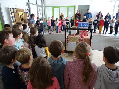 Über zwanzig Päckchen konnten an Reiner Dietl übergeben werden, der sich zum wiederholten Mal auf den Weg in die Ukraine macht, um dort zu helfen, wo Hilfe am notwendigsten ist. Dass in die Weihnachtspäckchen überwiedgend Grundnahrungsmittel und Hygieneartikel kommen erstaunte die Kinder schon, lesen sich ihre Wunschzettel, die sie an das Christkind geschrieben haben doch völlig anders. Aber kleine Freuden öffnen die Herzen und leisten ihren Beitrag, Not zu lindern und das Gefühl zu vermitteln, dass an die Menschen in der Partnergemeinde Welykyj Beresnyj gedacht wird und man sich mit ihnen solidarisch zeigt. Die Schülerinnen und Schüler sangen im Beisein von Bürgermeister Dr. Simon Haas das Lied "Singen wir im Schein der Kerzen", bevor sie beherzt zupackten und die Päckchen gemeinsam in den bereitgestellten Transporter verluden. Für die Partnerschule überreichte man noch zahlreiche selbstgebastelte Sterne, die alle Kinder aus Butterbrotpapiertüten hergestellt haben.