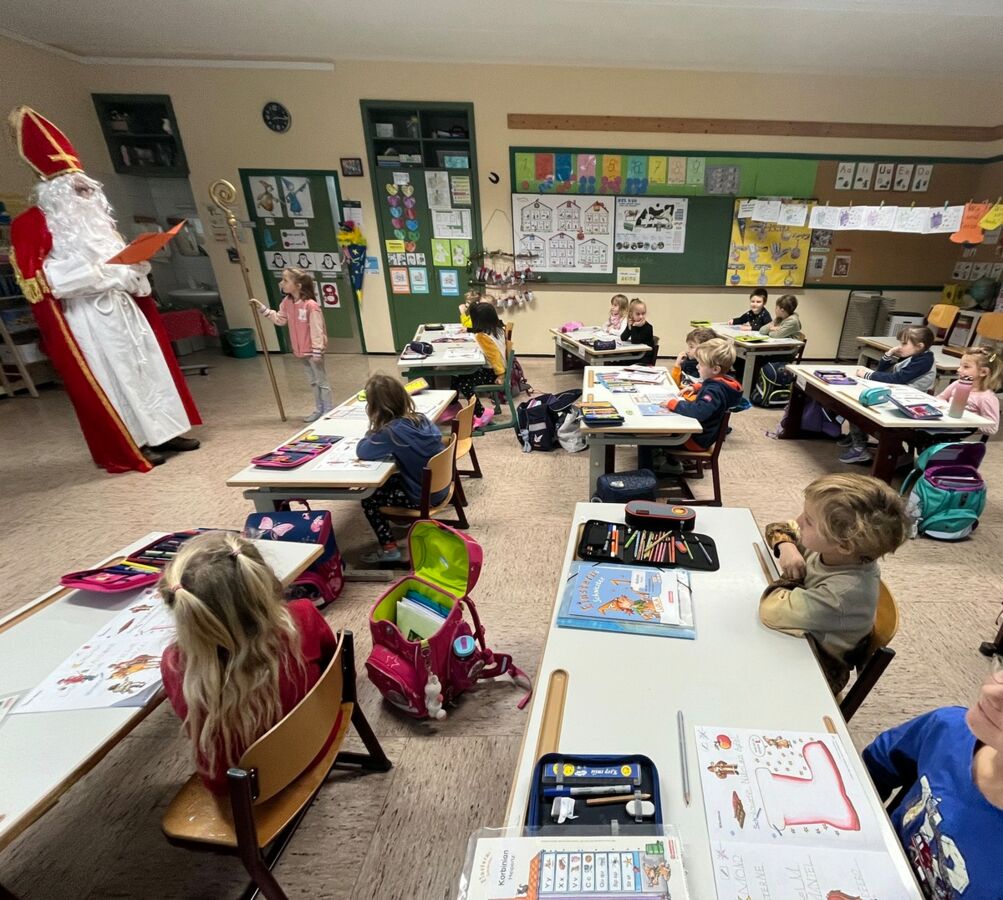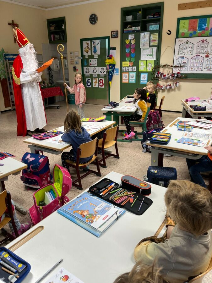 Mit Liedern und Gedichten begrüßten die Kinder der Klassen 1 und 2 in Haselbach den Nikolaus und staunten nicht schlecht, als er aus seinem goldenen Buch vorlas. Darin fand der hl. Mann nicht nur Worte des Lobes. Der ein oder andere musste auch etwas Tadel über sich ergehen lassen, da das leise Zuhören, das saubere Schreiben oder betonte Vorlesen noch nicht so recht klappen wollte. Aber insgesamt war der Nikolaus sehr zufrieden mit den Haselbacher Schülerinnen und Schülern, nahm ein paar Kindern noch das Versprechen ab, sich bis zum Besuch im nächsten Jahr ganz besonders fest anzustrengen und leerte dann seinen großen Sack aus, in dem sich leckere fairtrade Schokonikoläuse (vom Elternbeirat gesponsert) befanden. Zurück blieben frohe Schüler, die beeindruckt waren, wie detailgenau der Nikolaus über jeden Einzelnen von ihnen Bescheid wusste.