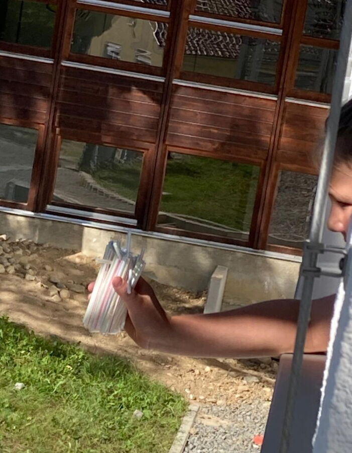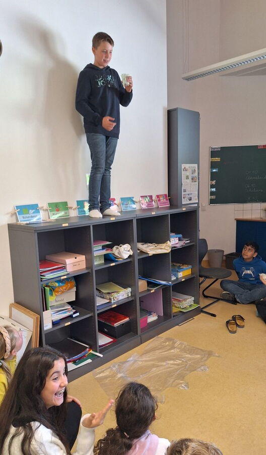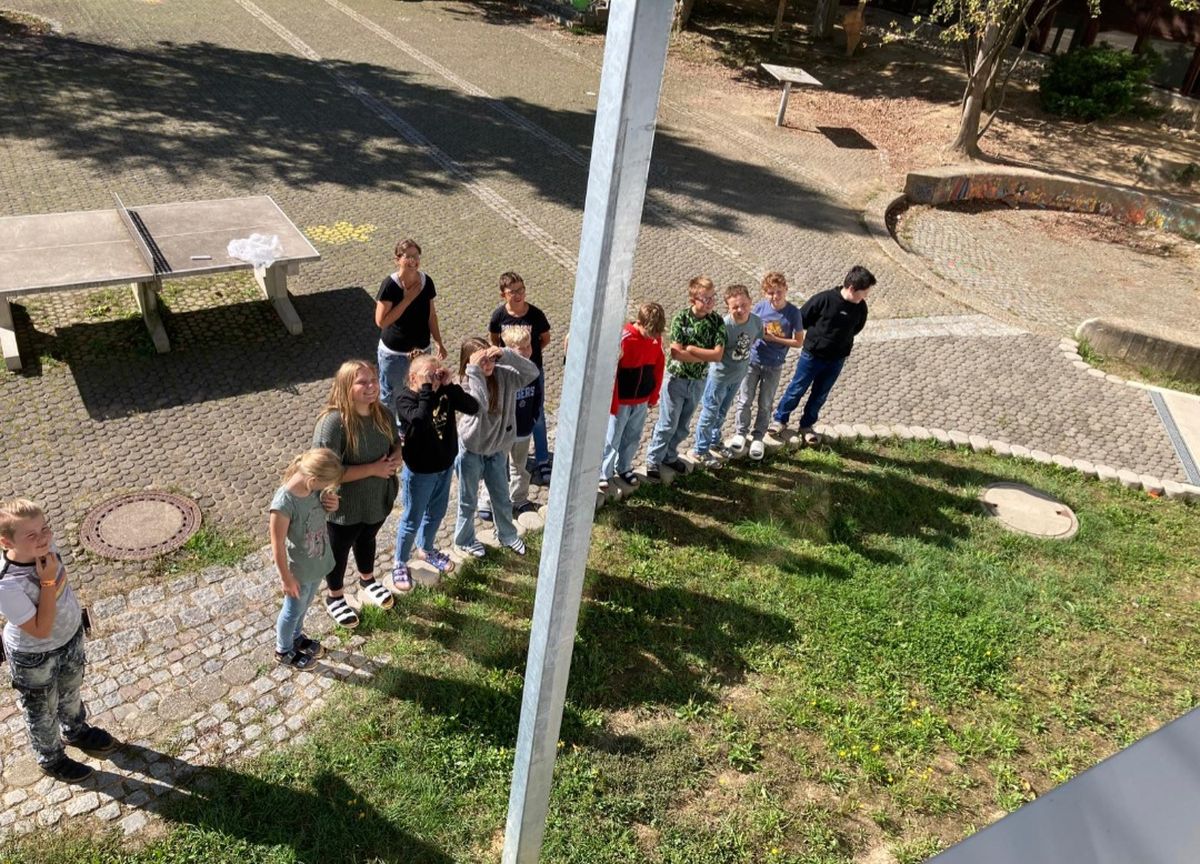 Um ein Ei nach dem freien Fall vor einer "Bruchlandung" zu retten, mussten die Kinder in kleinen Gruppen mit Hilfe von Strohhalmen und Tesa eine Rettungskapsel basteln. Die 5a versenkte die Eier dann im Pausenhof, die 5b in Ermangelung eines höher gelegenen Klassenzimmers vom Schrank.