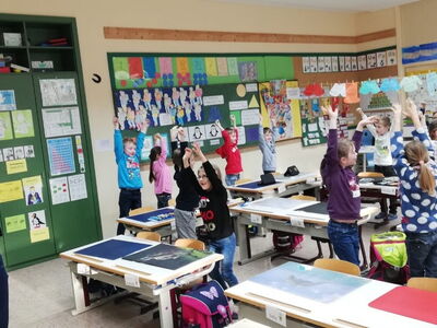 Die Schülerinnen und Schüler der Klasse 1a beim Klasse-2000-Projekt, zusammen mit Frau Raith