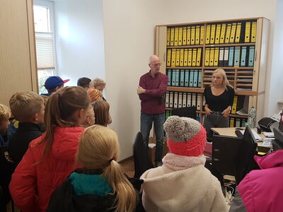 Im Oktober besuchte die Klasse 4b im Rahmen des Unterrichts das Rathaus in Mitterfels. Herr Mühlbauer, der Geschäftsstellenleiter, führte die Schülerinnen und Schüler durch alle Räume, sogar in die „Katakomben“ im Keller. Er beantwortete geduldig alle Fragen, ebenso wie Bürgermeister Heinrich Stenzel, der sich auch Zeit nahm für die Kinder und im Sitzungssaal Rede und Antwort stand.