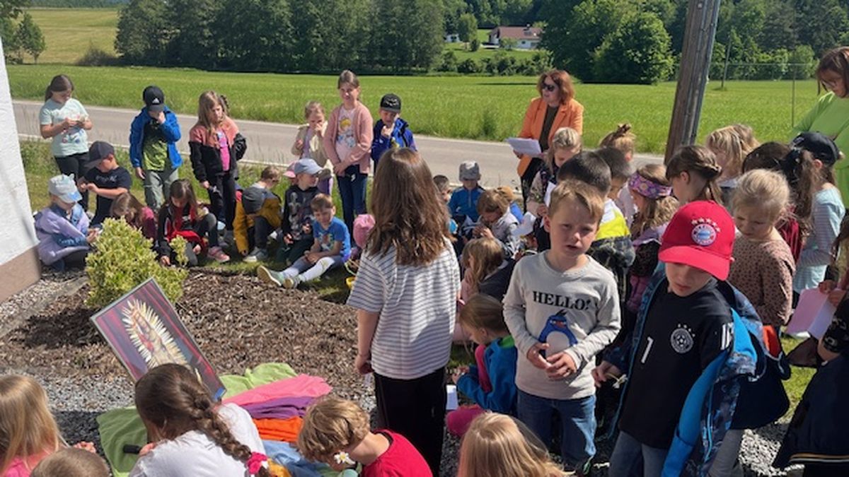 Konfessionsübergreifend machten sich bei strahlendem Sonnenschein alle Kinder der Grundschule Haselbach auf den Weg durch die blühende Natur, um am Ende des Dorfes miteinander eine Maiandacht zu gestalten. Josefine, Matthias und Annika entzündeten zu Beginn jeweils eine Kerze und sprachen dazu ein kurzes Gebet. Im Mittelpunkt stand ein großes Marienbild, das immer wieder in die Überlegungen, Gesänge und Gebete miteingebunden wurde. Alle Schülerinnen und Schüler brachten ein Gänseblümchen oder eine Margerite mit, um es intensiv zu betrachteten, mit ihrem Leben in Verbindung zu bringen und schließlich zu Blumenkränzen zu binden. Nachdem Kinder der Klasse 2b ihre Fürbitten vorgetragen hatten, sang man noch ein gemeinsames Schlusslied und kehrte schließlich zur Schule zurück.