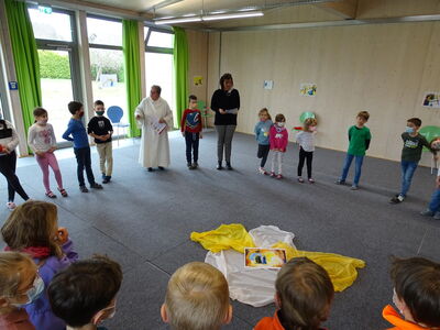 Kurz vor den Osterferien trafen sich die ersten und zweiten Klassen im Gymnastikraum in Haselbach, um zusammen mit der Gemeindereferentin Frau Birgit Blatz 15 Stationen des Kreuzweges zu gehen. Nachdem die Schülerinnen und Schüler berichteten, was sie auf den Bildern erkennen konnten, lasen die Lehrkräfte abwechselnd die dargestellten Begebenheiten vor.