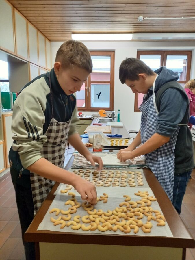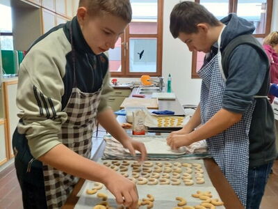Im Rahmen des Projekts „Praxis an Mittelschulen“ fertigten die Schülerinnen und Schüler der Gruppe Ernährung- und Soziales der 9. Klasse gemeinsam mit ihrer Lehrkraft Kathrin Bogenberger und den beiden externen Backexpertinnen Frau Zollner und Frau Krieger fünf verschiedene Sorten traditioneller Plätzchen an.