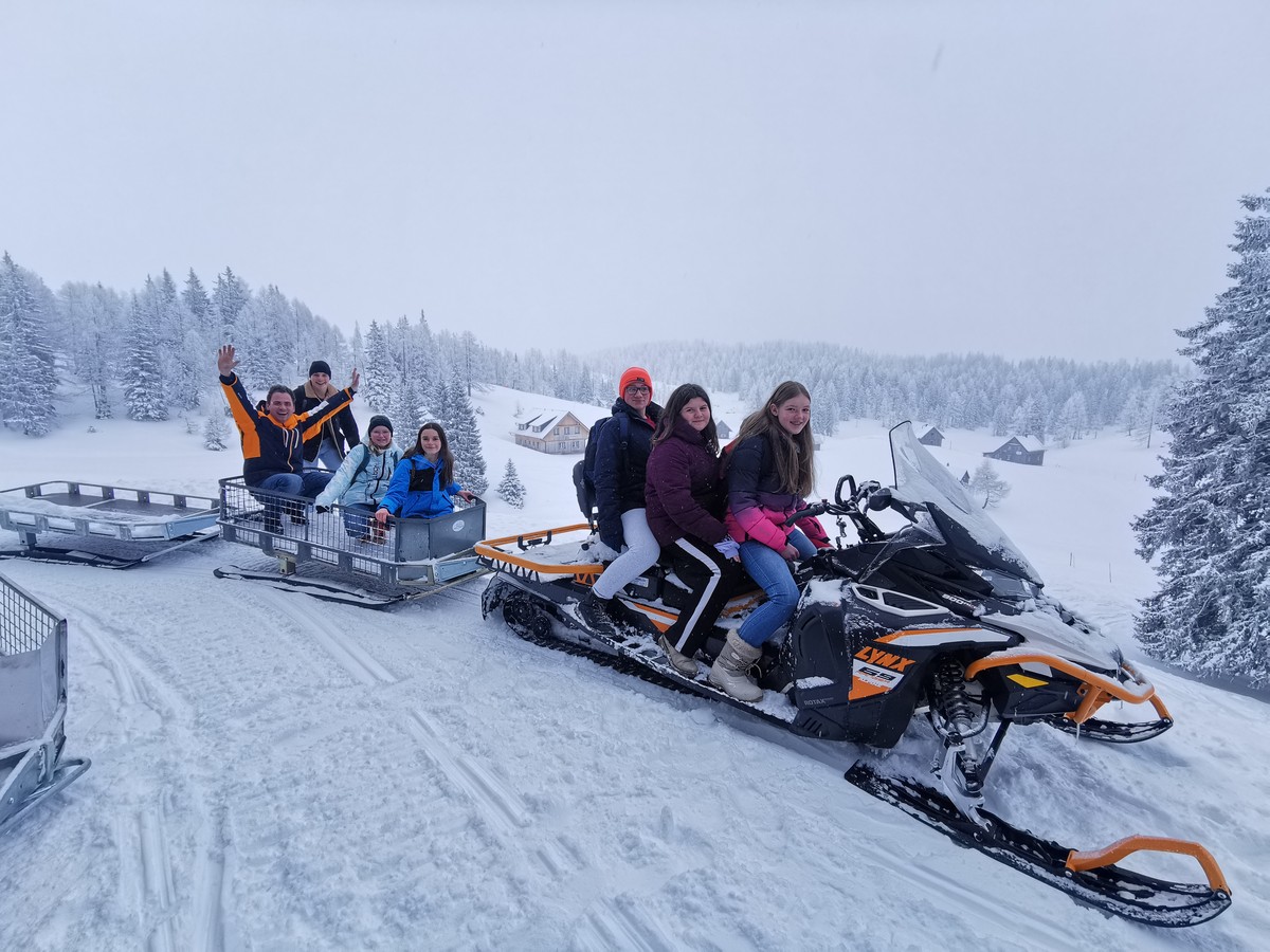 Die Gruppe unter der Leitung von Herrn Obermeier war direkt auf dem Berg inmitten der Skipisten untergebracht. Schon die Bergfahrt mit dem Bus wurde interessant, da Schneeketten angelegt werden mussten, um überhaupt zur Unterkunft zu kommen. Auf dem Parkplatz oben angekommen erfolgte der Transport von allem und allen zum Hollhaus.