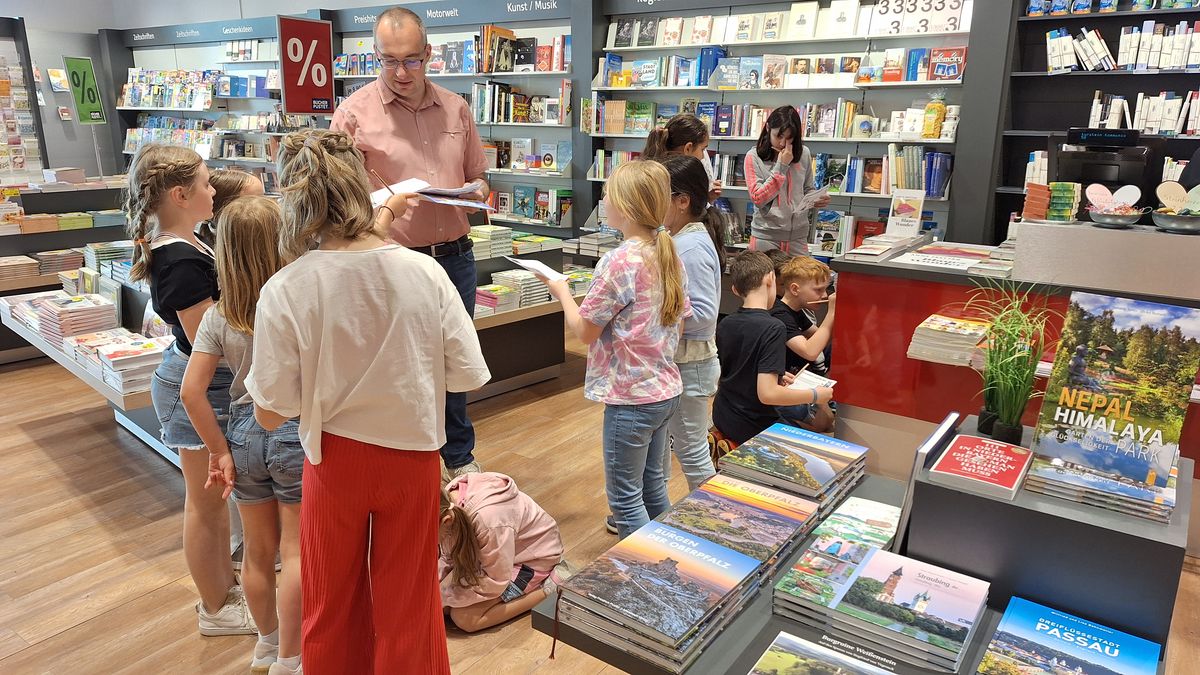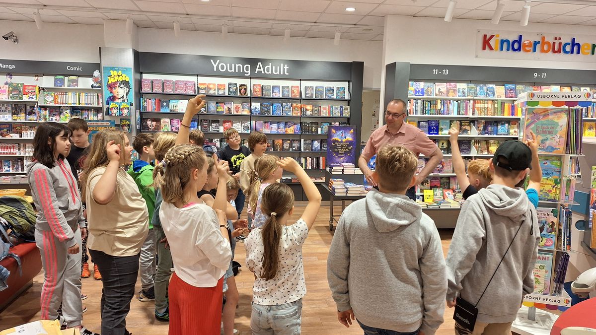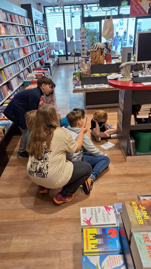 Herr Preißer empfing die beiden Klassen nacheinander sehr herzlich und schaffte es wie immer, das Interesse der Schülerinnen und Schüler für die Besonderheiten einer Buchhandlung zu wecken. Nachdem er den Ablauf der Rätselstationen erklärt hatte, durften die Kinder ausschwärmen und ihre Lösungszettel ausfüllen.
