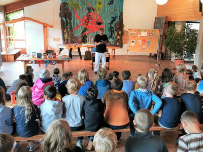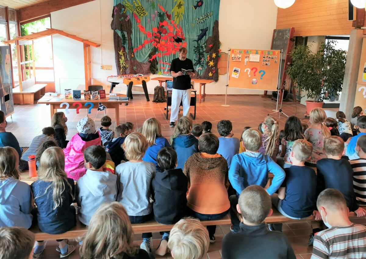 Der Schriftsteller wurde voller Freude empfangen und erzählte anfangs von seinem Werdegang, beantwortete die unzähligen Fragen der faszinierten Kinder über das Autorenleben im Allgemeinen, Schreibmotivation, sprach offen über seinen Verdienst und lachte mit ihnen über die ein oder andere Szene aus einem seiner Bücher. Sein neustes Kinderbuch ,,Survivors‘‘, welches von einer witzig-chaotischen Fisch-Crew handelt, stellte der Autor kurz vor und betrachtete hoch erfreut das gigantische Unterwasser-Wandbild der Schule, welches hervorragend zu seinem Buch-Cover passte. Im Anschluss gab er eine spannende Kostprobe aus dem neuesten ,,???-Buch‘‘ welches seiner Feder entsprang. Die Zuhörer lauschten dieser sichtlich angetan und löcherten den Vorleser im Anschluss erneut mit Anregungen, Fragen und Ideen über den Verlauf und die Charaktere der Geschichte.