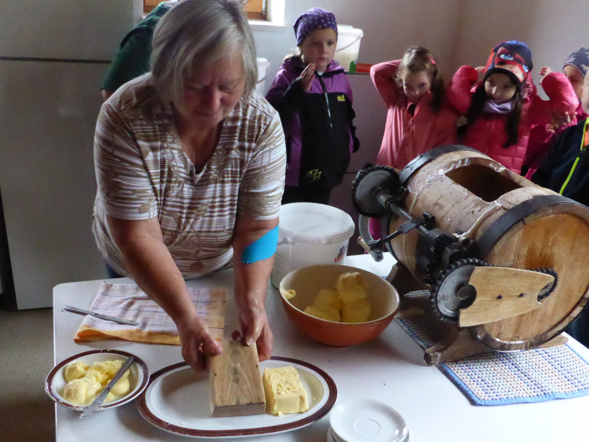 Nach einem lustigen Fußmarsch von Haselbach zum Bruckhof trafen die Kinder der Klassen 1a und 1b zusammen mit ihren Lehrerinnen Birgit Fuchshuber, Claudia Bach-Jobst und der Religionslehrerin Birgit Blatz am Bauernhof der Familie Frankl ein. Alle versammelten sich um den Brunnen, der den Mittelpunkt des Hofes darstellt. Aber neben dem Füttern von Kamerun-Schafen und Kühen, durften alle auch die Hühner und Enten bestaunen, Katzen streicheln. Außerdem erfuhren sie eine Menge über die Verarbeitung von Milch. Rahm kam in ein Butterfass, das jeder einmal kräftig drehen musste, damit darin Butter entstand. Diesen ließen sich die Kinder auf einem leckeren Brot gut schmecken und tranken dazu frisch gepressten Apfelsaft. Als Vorbereitung für die Woche der Gesundheit und Nachhaltigkeit endete der Besuch auf dem Bauernhof mit vielen neuen Eindrücken und enormen Wissenszuwachs.