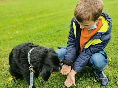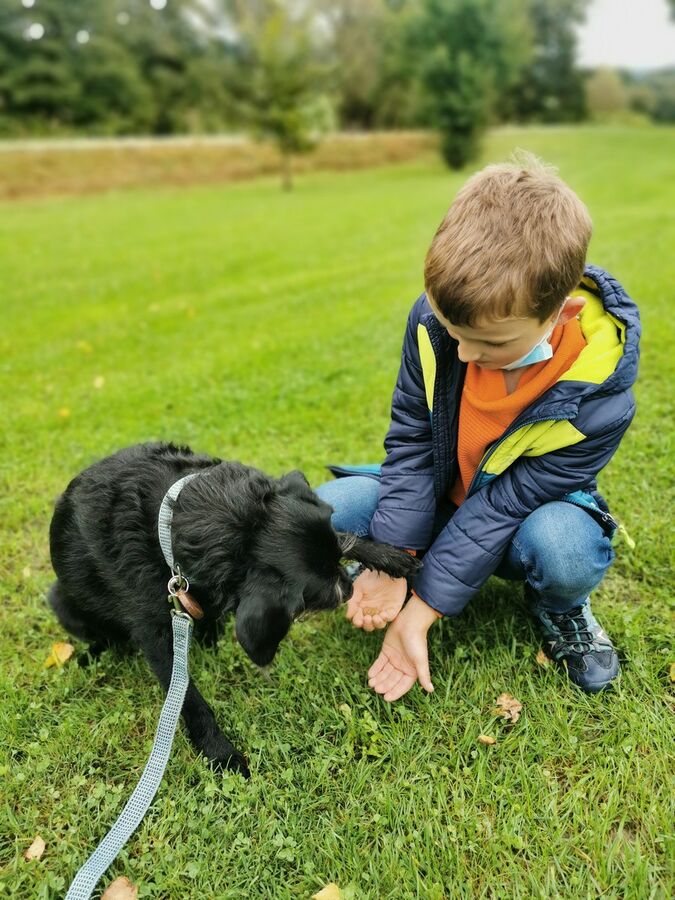 Akasha begleitete die Kinder auf ihrer Entdeckungsreise und sie durften die ruhige Hündin abwechselnd an der Leine führen und auch Tricks mit ihr machen.